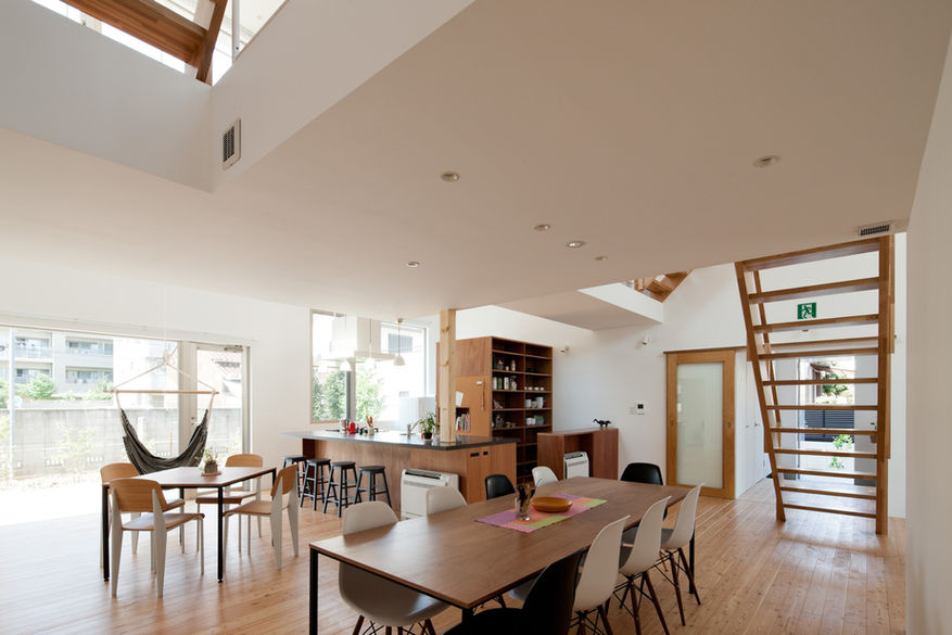 このプロジェクトでは新築であることを活かし、共に暮らすための新しい仕組みを考えるところから計画がスタートした。建物は単純なグリッドプランでありながら、上下に繋がる立体的な空間を共用部として内包することで、他人同士が一緒に暮らすことの課題をおおらかに解決している。ひとつながりの共用部には高さや広さの異なるさまざまな地形が生まれ、住人は仕事をしたり、誰かと談笑したり、一人で寛いだりと、その時の気分や過ごし方によって居場所選ぶことができる。本来他人だった人間同士が同じ空間に住まうことや、家族と異なる距離感をどう作り出すかなど、人と人との関係性を新しく考え、定義するような設計となっている。
