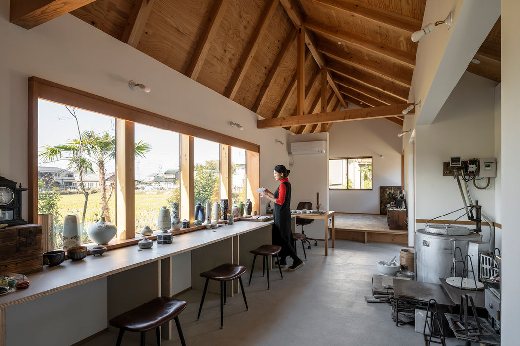 The making process is broadly divided between work involving kilns and water, and the delicate process of painting. In response, the sloped ceiling shifts gently in angle, creating subtle variation within a simple and comfortable space.